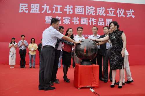 5月29日上午,民盟九江书画院成立暨九江市著名书画家作品展览在九江市水岸莲华销售中心举行,市政协副主席陶春元,市政协副主席、统战部长黄大明,市政协副主席李军,市委宣传部副部长、精神文明办主任刘明华,市委统战部副部长蔡卫宁,民盟江西省委专职副主委任江南,民盟抚州市主委章克敏,民盟九江市主委严平等领导出席开幕仪式。民盟九江学院委员会主委梅龙宝带领30余名盟员参加成立仪式。