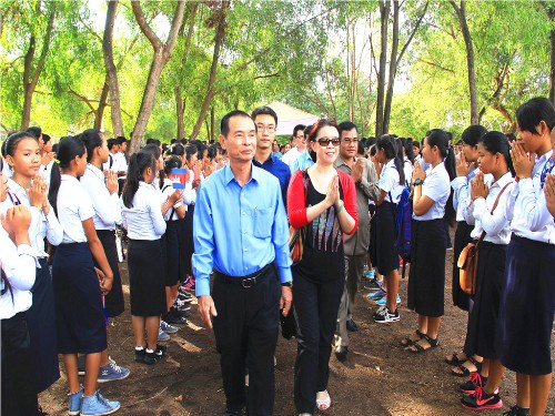 上午7时30分,吴哥高中校园内车水马龙,1000余名师生站立在校园甬道两旁,双手高举着中柬两国国旗,热烈欢迎中国和平发展基金会代表团的到来。俞小萱副秘书长、田耕主任、刘娜助理、柳江助理等一行在皮查南阁下和暹粒省副省长普赛德(POV Pisent)、柬埔寨教育青年体育部顾问翁思德(VNG Siteidy)、暹粒省教育青年体育厅前厅长斯提亚翁(SAY Tittya Vong)等的陪同下参观了吴哥高中孔子课堂。