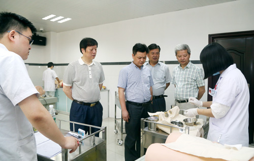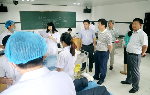 临床医学院2013级、2014级、2015级住院医师规范化培训学员2015-2016年度技能多站考试陆续开展。为严肃考场纪律,加强考风建设,确保考试有序开展, 6月13日上午,张志平院长、党委张南华书记、纪委刘英明书记、胡志坚副院长带队巡视考场,检查考务工作、考场秩序,科教科曾泉科长,临床技能中心韩峰主任等科室负责人参加巡考。