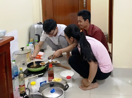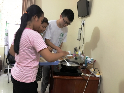 上午6时许,两位老师便开始为中午的聚餐准备各种所需食材。为保证健康和美味,猪肉、牛肉、青菜、水果等所有的食材都是选用最新鲜的。数名学生也是极其贴心地一早赶来帮忙。于是,小小的房间瞬间变身中文课堂,各种课堂比较抽象、难以理解的词汇和语法也变得生动形象,学生一点就通。几名热衷于中国美食的学生更是现场跟两位老师学做中国菜。