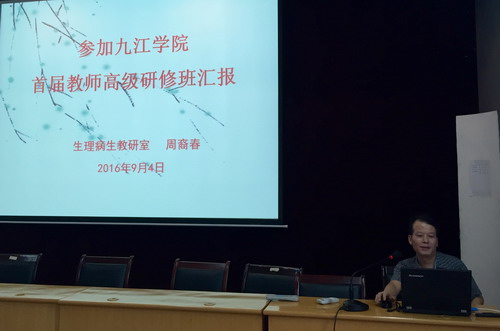 周裔春副教授随后汇报了参加在东南大学开办的九江学院首期教师高级研修班的学习体会。周教授详细的介绍了为期一周形式多样的培训交流活动。生动的将八场专题讲座的精华分享给了参会老师们,比如如何从本科教学评估角度对大学进行再认识、在信息化变革大潮中的如何迎接挑战与思考、怎样平衡科研与教学的关系等。