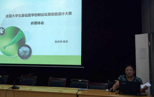 会上,殷嫦嫦教授首先介绍了参加“第四届全国大学生基础医学创新论坛暨实验设计大赛”的成功经验,包括如何挑选优秀学生,赛前的训练计划以及比赛当中的策略运用等,特别强调了团队合作所起到的重要作用。基础医学院4名参赛学生共获得三等奖2项、优秀奖2项。