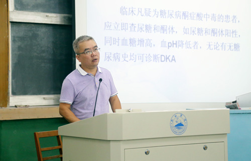 栾德强副教授医师对“糖尿病酮症酸中毒”的临床特点、临床体征、辅助检查、昏迷的鉴别诊断及酮症酸中毒的治疗进行了深入而全面的讲解。张院长与同学们一道认真地听课,并仔细记录,做听课笔记。