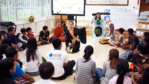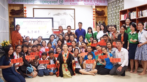 9月22日下午,柬埔寨王家研究院孔子学院孔子学院日系列活动之二——穿越时空体验“孔子课堂”的文化活动在金边孔子学院本部举行。该活动在孔子学院学生的满怀期待中如期开展。王楚燕老师扮演“孔子”,何其颖老师身穿飘逸的蓝色汉服主持本次活动,孔子学院教师及下午班100余名学生参加本次文化活动。