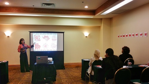 钟老师首先向来宾们介绍了中国民间剪纸的发展历史并带领大家一起探讨中西方剪纸艺术的异同。随后又向大家展示了抓髻娃娃、莲花童子、仙桃仙鹤、喜鹊鸳鸯等众多独具象征意义的剪纸符号。来宾们被这些生动形象又极具中国传统文化内涵的吉祥纹样深深地吸引,当看到精美的十二生肖剪纸作品时,更是连连称赞。