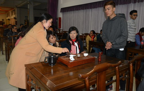 下午,旅游学院的杨婵容老师为体验团成员们带来一堂别开生面的中国茶艺课。杨老师简单的为大家讲解了中国的茶道文化、茶艺的相关礼仪,并向大家展示了中国的茶艺。经过老师详细的讲解和示范之后,大家两人一组,开始尝试动手泡茶,复习之前老师教授的动作和步骤。课程结束后,杨老师为表现优异的成员赠送了紫砂壶和茶叶,并鼓励大家回去后多多动手尝试。
