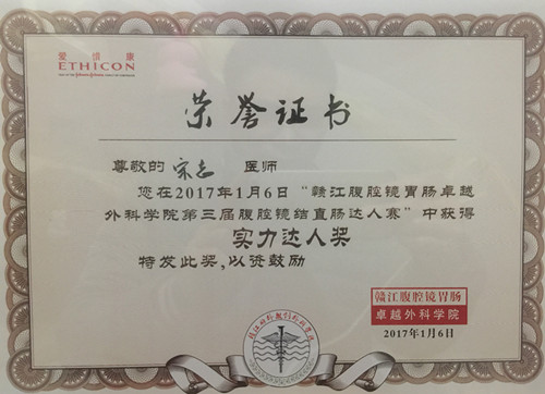 本次比赛由南大一附院胃肠外科李太原教授、江西省人民医院普外科曹虹主任等多位省内知名专家担任评委。临床医学院/附属医院普外科宋志主治医师代表临床医学院/附属医院普外科团队参加了比赛,经过激烈的选拔,荣获实力达人奖,该成绩的取得标志着临床医学院/附属医院腹腔镜胃肠手术技术的规范化与成熟化已经进入全省先进水平行列。