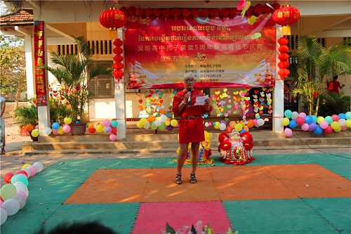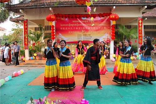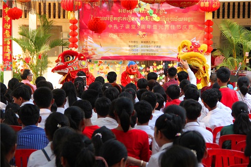 2月12日,柬埔寨孔子学院吴哥高中孔子课堂成立五周年庆典暨元宵佳节庆祝活动在暹粒省吴哥高中举行。暹粒省副省长金财恒(H.E.KIM Chhaihieng)、暹粒省教育厅副厅长李布纳(LY Bunna)出席活动,柬埔寨孔子学院院长谢莫尼勒(H.E. CHEA Munyrith)、中方院长夏修龙、吴哥高中校长任诺特(RIN Lot)及吴哥高中教师、学生和家长400余人参加了庆典。