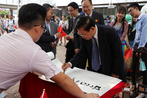 本次活动分为主展区和美食、传统游戏、语言文字、纪录片和文艺演出等展区,内容丰富,体现了各国多元文化。中国馆主展区热闹非凡, “我想试穿汉服”“我想学写毛笔字”“我想喝中国茶”……一连串的欢声笑语萦绕着中国馆。想要试穿中国古典服装的人排起了长队,各国游客们穿着中国古典汉服、戏服、清宫装拍照,喜悦之情洋溢在微笑的面庞。书法、茶艺、古筝前面也已挤满想要学习尝试的热情游客。柬埔寨教育、青年、体育部国务秘书约克诺伊等领导兴致勃勃地来到中国馆,他挥笔写下“中柬友谊万岁”,赢得现场热烈掌声。
