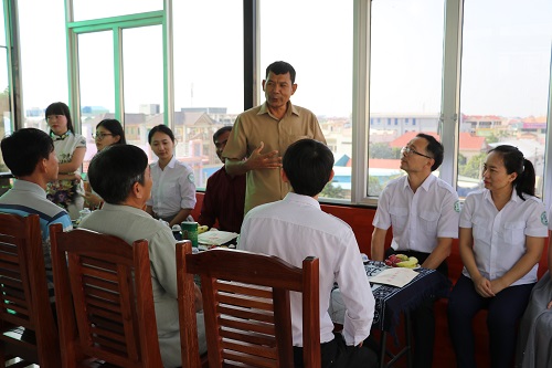 双方在柬埔寨王家研究院孔子学院茶文化室进行了友好会谈和交流。夏修龙院长对桑皮先生和宋春龙先生的到访表示热烈的欢迎,感谢柬埔寨国家语言文字委员会为在柬工作的中方教师教授柬语和柬埔寨文化。他说,此次活动主要是为了让大家了解中国茶文化,他希望此次文化交流可以增强老师们之间的交流。