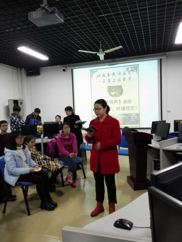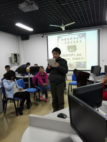 朗读会在土建学院秦华康同学带来的慷慨激昂的《九江赋》中拉开序幕,诚如他所说的:后学子弟,来自九州,缘分所致,齐聚九江宝地,江西名府,白鹿书香,一展斯地尽美!