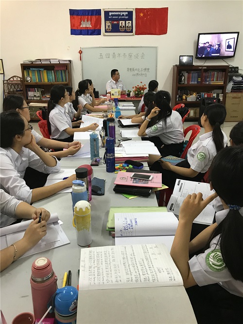 5月4日,适逢“五四”青年节,柬埔寨孔子学院暹粒省吴哥高中孔子课堂全体教师齐聚孔子课堂办公室,举办了以“牢记使命,筑梦未来”为主题的青年节教师座谈会。