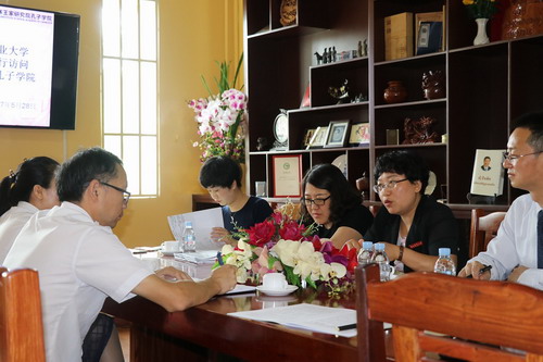 会见会上,夏修龙院长代表孔院对代表团的来访表示热烈的欢迎,他向云南农业大学代表团介绍了柬埔寨王家研究院孔子学院的基本情况。他说,柬埔寨王家研究院孔子学院自2009年成立以来,已在柬埔寨形成一张中华文化的重要名片,在汉语教学和文化交流方面做出了不懈的努力。其中,孔子学院的主要特色体现在柬埔寨的政府部门开设了官员汉语班和官兵汉语班,同时也在柬埔寨的一些大学开设了中文系,将汉语纳入学分制,比如亚欧大学、棉芷大学,这对汉语教育纳入柬埔寨国民教育体系起着重要的推动作用。