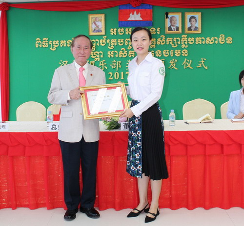 方侨生董事长(Pu Khear Se)在颁奖仪式中致辞,他指出,中国政府推行的“一带一路”政策将惠及柬埔寨的发展。纵观柬埔寨和加华银行的发展历史,加华银行离不开中文人才,中文教育对加华银行非常重要。随后,方董事长为柬埔寨孔子学院及在此任课的邢慧莹、朱云云两位老师颁发了证书和奖品,以此感谢柬埔寨孔子学院对加华银行中文教学的大力支持,并感谢两位老师的辛勤工作,他希望和柬埔寨孔子学院保持长期合作。