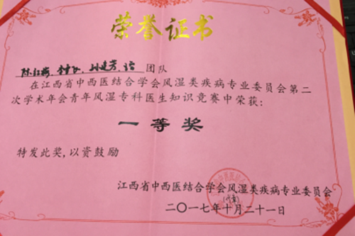 近日,由江西省中西医结合学会风湿类疾病专业委员会主办的第二次学术年会青年风湿专科医师知识竞赛在南昌盛大举行。临床医学院/附属医院风湿免疫科的李雪飞医师所在的团队在知识竞赛中荣获一等奖。