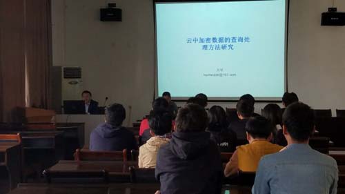 讲座中,吴斌博士根据自己的研究方向,向师生讲解了信息安全领域的研究热点--云中加密数据的查询处理方法。本报告首先介绍了云计算在带给用户方便的同时,也带来了诸多的安全问题,为了消除云中的安全威胁,需要系列的搜索加密方案。随后详细介绍了对云服务器上的加密图数据进行查询的各种优化方案。