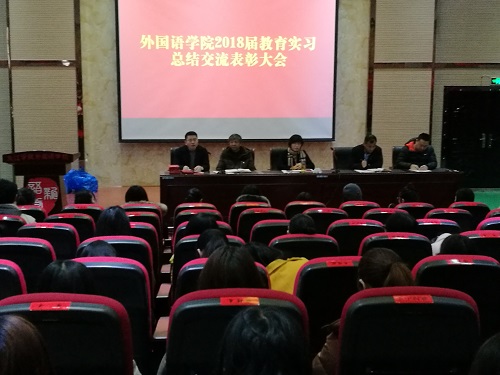 在教务处和实验中心的大力支持和协助下,在广大师生共同努力下,外国语学院2018届师范生教育实习工作圆满结束, 12月29日上午,外国语学院在香远楼报告厅召开了师范生教育实习总结表彰交流大会。外国语学院院长韩琨、副院长柴克清、副书记彭晓、英语教育教研室主任周志高、教务科长王伟、英语教育教研室全体教师及2018届英语专业师范实习生参加了此次会议。会议由英语教育教研室主任周志高主持。