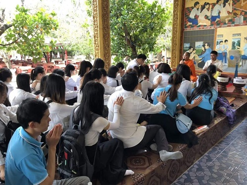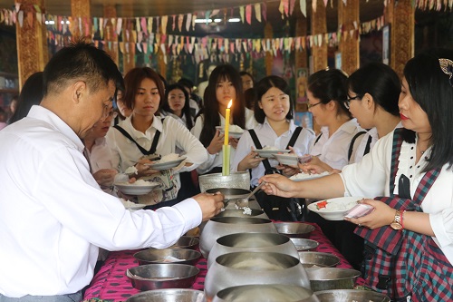 上午10时,柬埔寨孔子学院教师抵达另一座庙宇Vipassana Dhura Buddhist Centre of Kingdom of Cambodia进行祭拜祈福,为该寺庙的僧侣提供美食贡品,接受僧侣的诵经祈福。午间,教师们按照当地用餐习俗,围坐一起共享柬式午餐,进一步感受和体验柬埔寨当地民俗,在增进中柬方教师间友谊的同时,进一步加深了中柬方教师对彼此文化的了解。