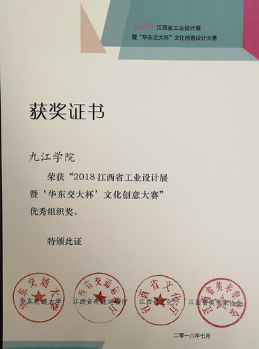 为积极响应国家号召,进一步激发当代大学生、优秀设计师和艺术家的创新精神,由江西省文化厅、江西省交通运输厅、江西省美术家协会、华东交通大学联合举办的2018江西省工业设计展暨“华东交大杯”文化创意设计大赛落下帷幕,此次比赛参赛单位有18所高校,征集参赛作品779件。经专家评审,我校产品设计专业A1551、A1552班学生代表学校参加比赛,喜获金奖5项,银奖8项,铜奖9项,优秀奖15项,九江学院荣获优秀组织奖。