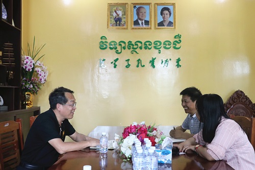 10月22日,武汉市新新图书有限公司王奎英董事长一行两人访问了柬埔寨皇家科学院孔子学院,柬埔寨皇家科学院孔子学院中方院长柴克清、柬方院长苏碧娜(Vuth Sopheakna)在孔子学院一楼会议室接待来宾,双方展开友好会谈。