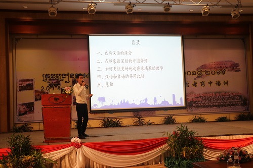 23日下午6时,闭幕式上,领导专家为柬埔寨24位在国家汉办组织的教案大赛中荣获奖项的志愿者教师颁奖。两位志愿者代表发言,从志愿者的角度对此次培训的内容进行总结,表达了对此次培训的感谢。柬埔寨皇家科学院孔子学院中方院长柴克清先生致闭幕式总结辞,他提到,“志愿者们是年轻人,是最该学习的年龄段。希望各位志愿者教师可以将此次培训中学习到的教学理论、教学方法在实践去运用和检验,为培养柬埔寨汉语高端人才、促进中柬两国民心相通贡献自己应有的力量。”
