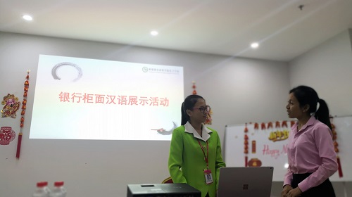 2018年12月29日下午,为检测学员本学期学习成果、体验汉语的文化传播功能、培养学员的汉语交际能力,柬埔寨皇家科学院孔子学院加华集团汉语中心在奥林匹亚城举办了“迎新年,银行柜面服务汉语展示”主题文化活动。由加华集团银行、工程、物流和物业管理等部门的优秀职员组成的加华集团汉语教学中心高级班学员参加了本次活动。