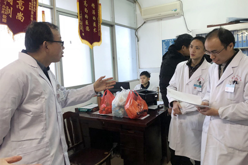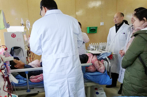 当日,临床医学院/附属医院肾内科主任高新庐、主治医师黄赟、护士长曹红杏等一早驱车前往都昌县人民医院。到达该院后经过了解,该院肾内科有不少维持血液透析患者合并继发有甲状旁腺功能亢进,且医院的治疗手段主要是以药物调节钙磷代谢紊乱。针对都昌县人民医院肾内科实际需要,高新庐主任等通过现场查房的方式对患者义诊,并对科室医生进行了实例指导。