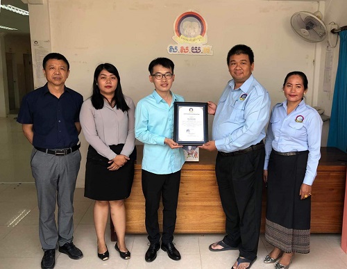 随后,茶胶青年联合会汉语中心负责人何索昆先生为汉语教师志愿者王鹏颁发了感谢证书及纪念品,并对汉语教师志愿者在茶胶展开的的汉语语言及文化教学给予肯定及赞赏。