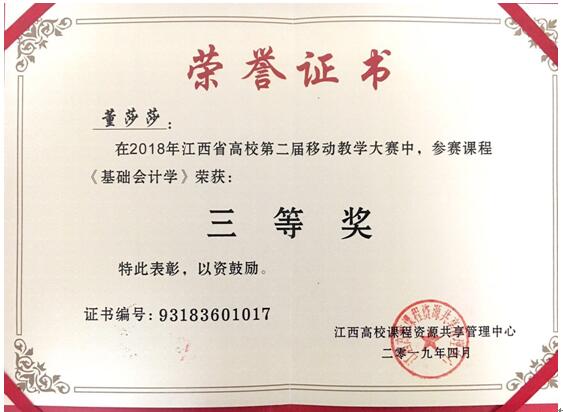 4月23日,江西省高校课程资源共享联盟年会暨学术交流研讨会在南昌国际博览城隆重召开,会上,对省第二届高校移动教学大赛获奖教师和优秀组织奖获奖学校进行了颁奖,我校周骞、董莎莎两位教师荣获三等奖,傅江宏、黄健、何刚、许成锋、袁荣华等 5名教师荣获“优秀教师”奖项,张梅等20名教师荣获“教学先锋”奖项,学校获大赛“优秀组织奖”。
