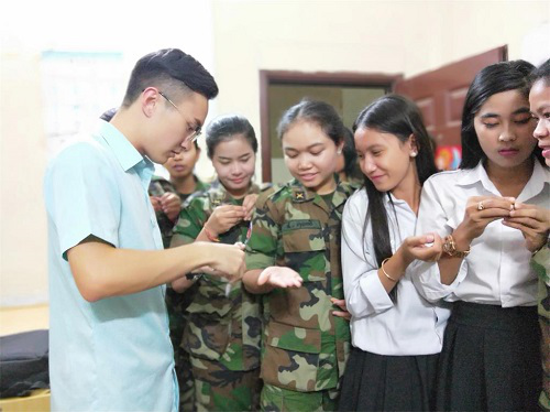 两位学员代表也表达了自己学习中文的目的和想法。金思文(SOK KIM SREANG)少尉说他想在今年考过HSK4级,争取拿到孔子学院奖学金去中国读书;欧递尼(Ody Nick)上校说自己学习中文是为了更方便工作,希望有机会能够去中国的军队参观交流。