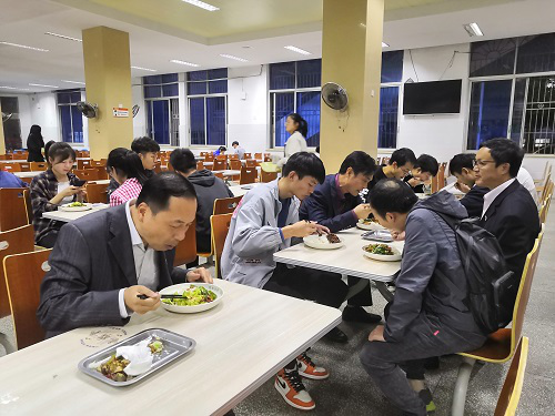 随后,杨副校长与学生一起走进食堂,一起排队买饭,亲自为学生刷卡并共进晚餐。用餐期间,杨副校长仔细了解了学生的饮食习惯、日常生活开销等,切身感受了学生心底最真实的声音;分享了自己读书时的故事。