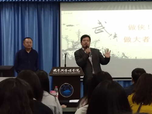 11月5日晚,中国武侠文学学会副会长,西南大学文学韩云波教授来我校举行学术讲座。在文友楼205教室为文传学院师生作了一场题为“金庸小说的‘中国道路’”的学术报告。副校长陈春生主持报告会。校团委负责人、文传学院班子成员、教师代表及100余名学生聆听了此次讲座。