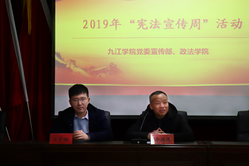12月3日晚,九江市委党校教师汪宇翔应邀参加九江学院“宪法宣传周”活动,为高校师生作了一场“学习宪法新精神,推动宪法新实践”专题讲座。此次讲座由校党委宣传部和政法学院合办,由九江学院政法学院副院长李德恩主持,师生们积极参与。