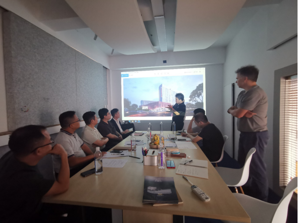 在上海浚源建筑设计有限公司,二附院项目建设指挥部一行与全咨单位、设计单位人员一起分专业讨论了初步设计中的难点、进度以及需要建设单位解决的问题。在方案设计单位法国AIA建筑工程联合设计集团,项目建设指挥部一行与项目总设计师Simon TSOUDEROS、建筑设计师杨海等就项目方案的外立面优化、项目的设计进度节点等进行了讨论。