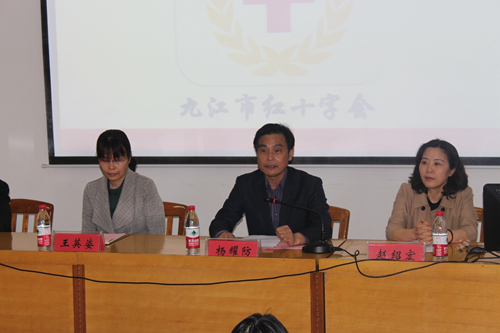 为了更广泛地在校园内开展和普及应急救护知识与技能培训工作,切实提高我校师生的安全防范意识、防灾避险和自救互救能力,11月11日下午,在学生处、团委、保卫处、综治办等部门的支持与配合下,由校医院与九江市红十字会联合组织的“校园应急救护知识暨急救员培训班”开班了。杨耀防副校长、九江市红十字会专职副会长赵绍红、九江市红十字会救护培训中心、校综治办、学生处、校医院相关人员参加了开班仪式。