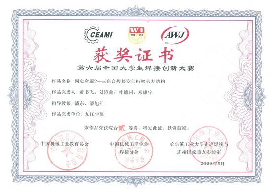 我校材料科学与工程学院积极组织焊接技术与工程专业学子紧密结合赛事题目要求,从材料选择、焊接工艺设计、结构设计、装备智能化、方案经济性等方面进行设计,设计作品面向工程应用。经校内遴选,共有4项作品参加全国决赛。其中,2021级本科生文杰、涂敏捷、邹绍坤、游畅的作品《三脚架焊接桁架承力结构》荣获全国一等奖;2021级本科生黄书飞、叶德州、刘涛鑫、邓康宁的作品《三角台焊接空间桁架承力结构》和吴方园、张高阳、樊友健、朱雨珊(2022级)的作品《六边形截面三角形空间桁架承力结构》荣获全国二等奖; 2021级本科生周梅炎、张启明、徐建波、廖佳豪的作品《圆柱型承力结构》荣获全国三等奖。