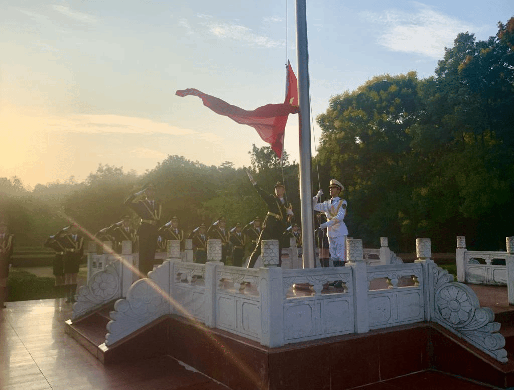 上午七时整,九江学院近千名青年师生齐聚西大门升旗广场,学校国旗护卫队员身着礼兵服,迈着铿锵有力的步伐,护送国旗至升旗台。伴随着雄壮激昂的《义勇军进行曲》,鲜艳的五星红旗迎着旭日冉冉升起,观礼方阵庄严肃立,向国旗行注目礼,伴着国歌齐声高唱,表达对祖国的热爱和崇敬,对和平的向往与坚守。
