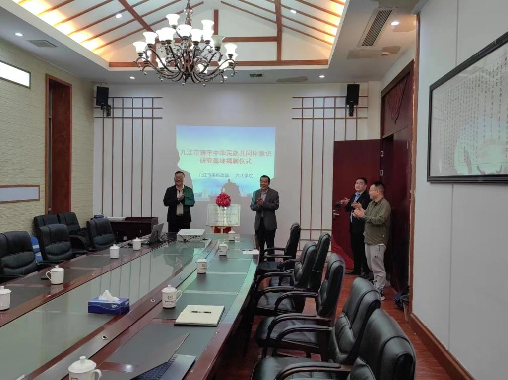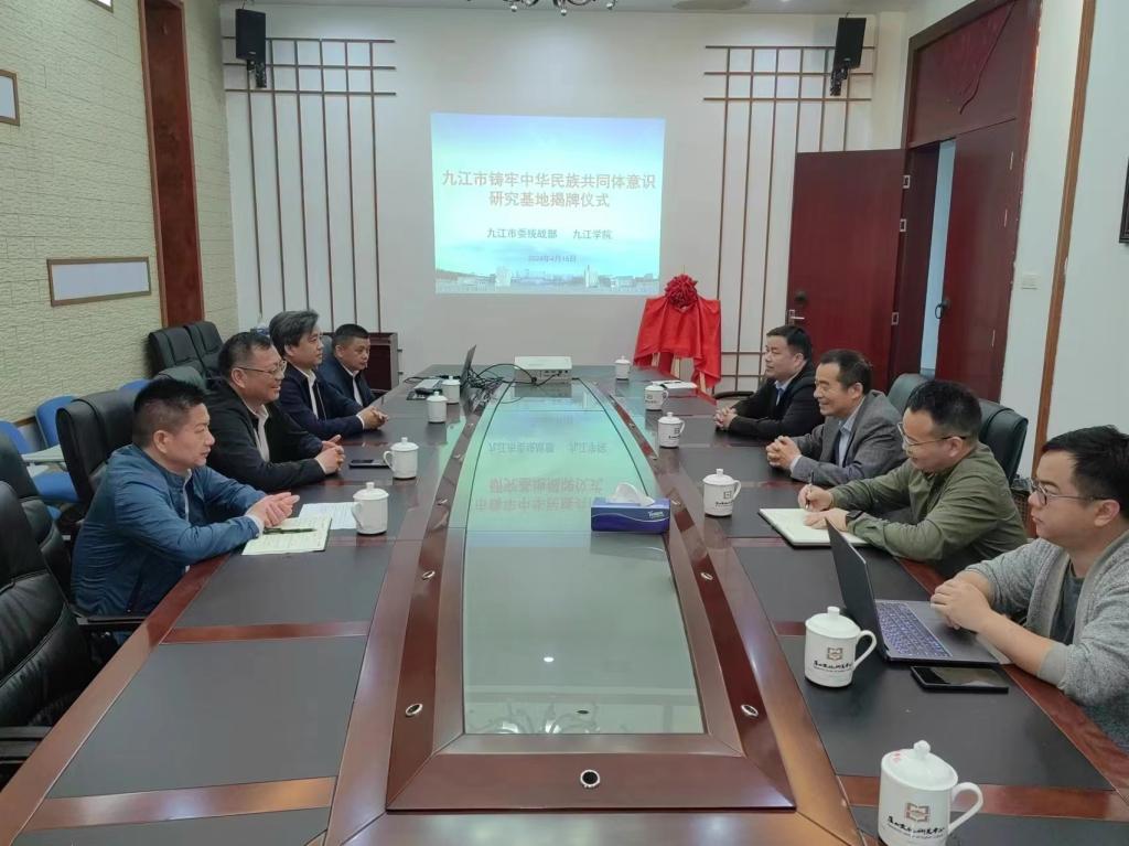为加强铸牢中华民族共同体意识工作,深入开展中华民族共同体理论体系研究,充分发挥高校在理论研究、政策宣讲的主阵地作用,4月16日上午,九江市铸牢中华民族共同体意识研究基地揭牌仪式在学校举行。九江市市民族宗教事务服务中心主任胡定文、副主任虞功智,校党委委员、统战部长刘遵海,校民族理论研究成员参加揭牌仪式。胡定文和刘遵海共同为九江市铸牢中华民族共同体意识研究基地揭牌。