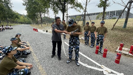 “一提、二拔、三握、四压,保持2到3米安全距离,对准火源根部扫射!”在实操训练区,消防宣讲员的口令清晰有力。新生们以连队为单位,分组奔向模拟灭火点,面对燃烧的油盆火,按照“提、拔、握、压”四步法实战操作。来自外国语学院的新生李娜同学在成功扑灭油盆火后,兴奋地说:“以前只在电视上见过灭火,今天亲手把火扑灭,既紧张又有成就感,以后遇到小火情就知道该怎么处理了。”此外,消防宣讲员还现场演示了消火栓水带连接等技能,并邀请新生上手体验,亲身实操。