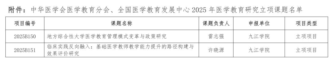近日,中华医学会医学教育分会、全国医学教育发展中心正式公布2025年度医学教育研究课题立项结果。本次课题申报共吸引全国120所医学院校及相关单位参与,申报课题870项。经专家组严格评审,最终确定立项课题424项。我校共申报两项课题,均成功获得立项,在本轮评审中表现突出,取得历史性突破,这标志着我校在医学教育研究方面获得国家级认可,彰显了学校在医学教育领域的持续探索与创新能力。