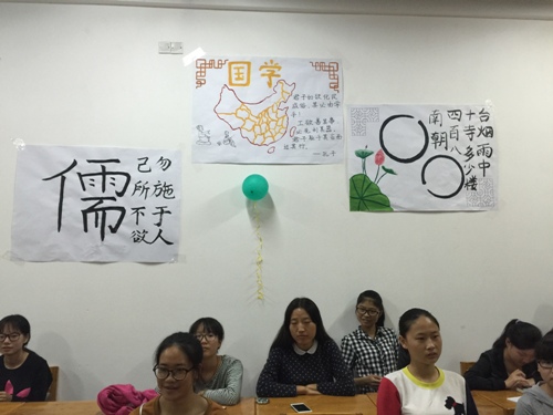 活动伊始,主持人以PPT形式给同学们观看了国学视频。紧接着,同学们的齐声诵读国学经典。一个个站姿笔挺的身影,在烛光的渲染下显得异常庄重;带着对古代文人的敬重与怀念,优雅主旋律一般的气氛让人分外陶醉。其中,《弟子规》、《道德经》、《千字文》、中国四大名著等国学大赏的演说齐出不穷;国学竞答更加成为同学们讨论的热点话题;加上五步拳的表演,简直将活动推向了一个高潮。现场的文字气息非常浓厚,甲骨文词句、水墨画、映着传统文化的简洁黑白画扇……都让人神往不已。墙纸上的“今日时钟”与“明日宣言”也同样提醒着同学们对待国学传承的诺言。伴着诸多“艺术品”的一一展现,活动也接近了尾声。