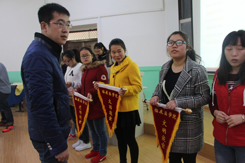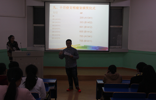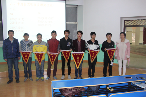 燕碧波与夏虹分别为获奖班级、寝室颁发锦旗。颁奖仪式结束后,燕碧波讲了话,他激励同学们做好寝室教室卫生工作,创造舒适的生活学习环境,增强同学们的集体荣誉感和凝聚力!