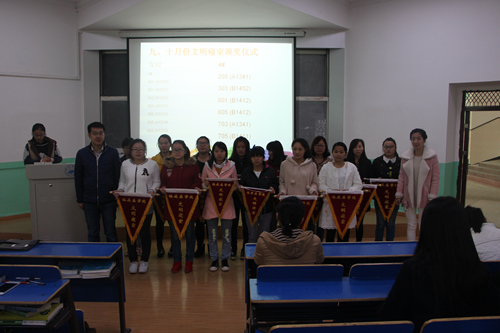 经过两个月的查班、查寝、打分、总分,最终以下班级获得文明班级称号:A1216/17班、A1341班、 A1313/14班。以下寝室获得文明寝室称号:女寝203、205、301、407、601、602、605;男寝201、301、302、303、305、505、603、205、601、605、703、705。