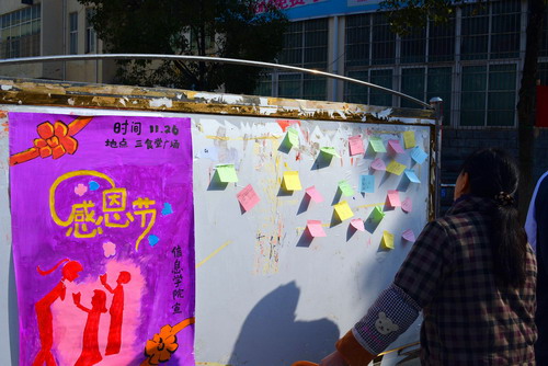当日上午,信息学院青年志愿者服务队早早来到了三食堂广场放置座椅和展板,贴出感恩主题海报做活动准备工作。随后活动开展,志愿者们邀请在场同学们参与活动,并耐心的讲解活动的形式和主题,号召同学们常怀感恩,珍惜身边的馈赠。同学们积极参与感恩签名活动和视频录制活动,并用一张张彩色纸条叙写真情话语来表达对楼道阿姨长期服务工作的肯定和谢意。