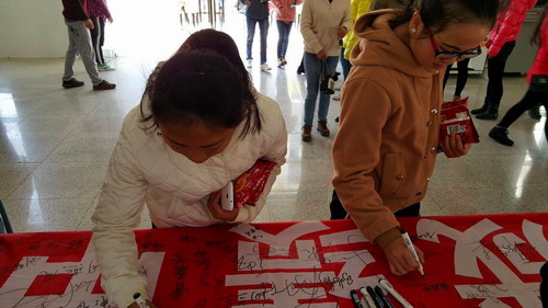 进一步严肃考风考纪、净化考试环境,推动我八里湖校区学风建设,12月16日上午,八里湖校区学生会联合体育、政法学院学生会在宿舍楼大厅前开展“诚信应考,拒绝舞弊”签名活动。此次活动得到同学们的热烈响应。