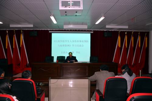 为了预防和依法处理学生人身伤害事故,保护学生和学校的合法权益,维护正常的教育教学秩序,3月9日下午,政法学院组织了《江西省学生人身伤害事故预防与处理条例》(以下简称《条例》)学习大会,政法学院全体辅导员、班主任、任课教师、各班班长、学生会干部等参加了学习会。政法学院党委书记高翔向参会师生做了学习报告。