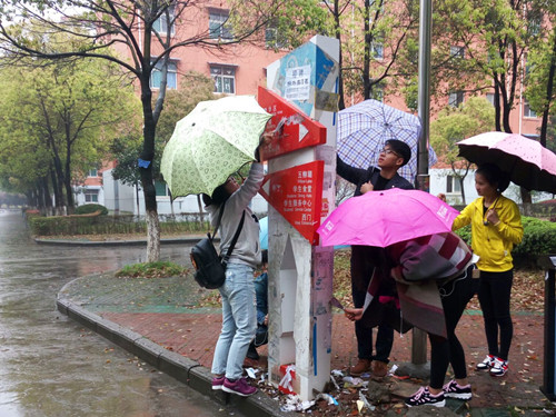 当日下午2:30,学生党支部的全体成员在首先香远楼大厅集合分组,然后他们从组长手中领取了清理“牛皮癣”的工具就朝他们服务的地点山谷大道和渊明大道出发了。