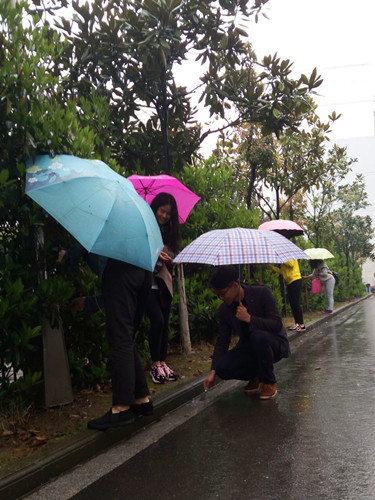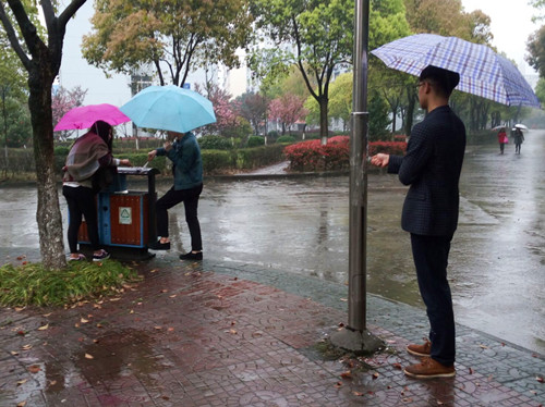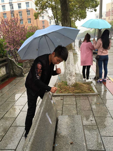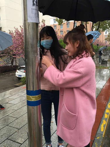 雨水没有影响志愿者的热情却影响了大家工作的进度和效果,只见志愿者们一手撑着伞,一手拿着工作在石凳、墙壁或者垃圾桶上面铲五花八门的广告纸,有时候遇到比较难清理的顽固广告,他们还不得不把雨伞夹在脖子和肩膀上。虽然辛苦,但是学生党员志愿都特别认真的对待,每个人都一丝不苟,小心翼翼的一点点清除随处张贴的小广告。经过一下午的努力,两条大道周围的建筑物和公共设施变得干净整洁,所有的小广告都被彻底清除。看着努力的成果,志愿者们也是会心一笑。