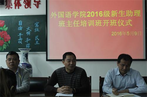 5月9日下午,外国语学院在香远楼315会议室举行了2016级新生助理班主任培训班开班仪式。院党委书记杨杰、副书记彭晓、学生科吴章义老师出席了会议,院学生会主席团及30名新生助理班主任参加了此次开班仪式,仪式由彭晓副书记主持。