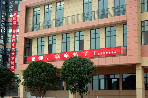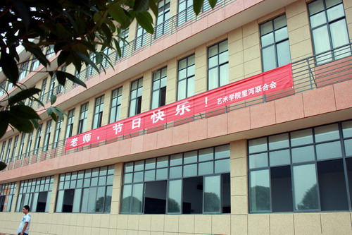 新艺术大楼的二楼两侧醒目地悬挂祝福横幅,右边是学院团学会制作的横幅“老师,您辛苦了!”,左边是学生社团——星河联合会制作的“老师,节日快乐!”,醒目的祝福语渲染了一种浓浓的节日气氛,是每一位走上天桥、走入艺术大楼的老师们心中涌起一种甜蜜的温馨。